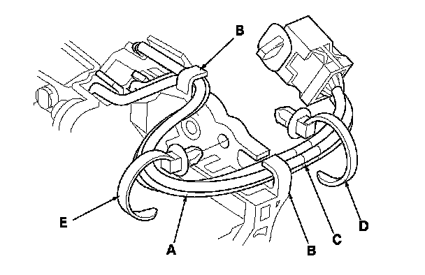 19. Tie the harness together into bundle with new harness wire tie, then install the harness wire tie (E) on the shift lever bracket.
