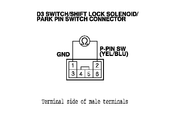 10. Check for continuity between D3 switch/shift lock solenoid/park pin switch connector terminals No. 1 and No. 2 while the shift lever is in P, and when the shift lever is out of P.