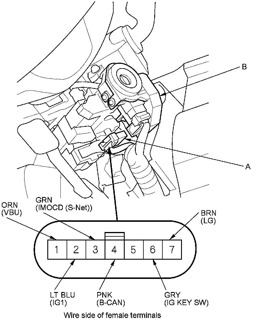 3. Disconnect the 7P connector (A) from the immobilizer-keyless control unit (B).