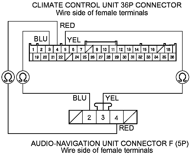 6. '07-09 models: Check for continuity between the following terminals of the climate control unit 36P connector and audio-navigation unit connector F (5P).