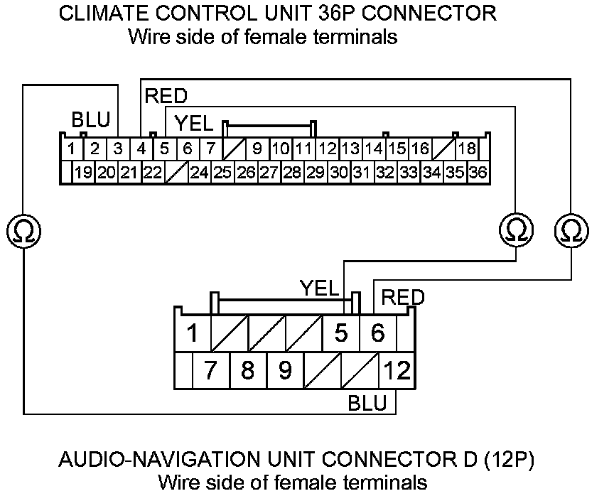 7. '10-11 models: Check for continuity between the following terminals of the climate control unit 36P connector and audio-navigation unit connector D (12P).