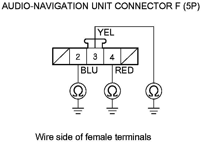 8. '07-09 models: Check for continuity between body ground and audio-navigation unit connector F (5P) terminals No. 2, 3, and No. 4 individually.