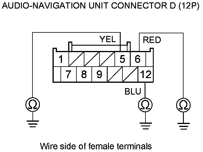 9. '10-11 models: Check for continuity between body ground and audio-navigation unit connector D (12P) terminals No. 5, 6, and No. 12 individually.