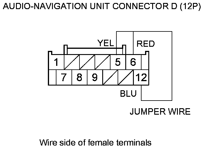 13. '10-11 models: Connect audio-navigation unit connector D (12P) terminals No. 5, 6, and No. 12 with a jumper wire.