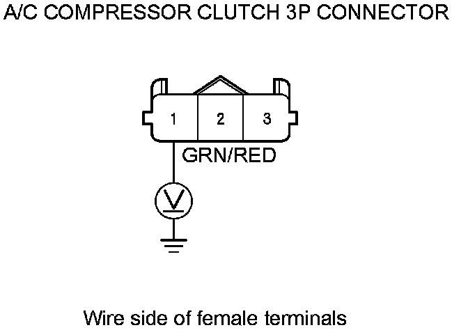 11. Measure the voltage between the A/C compressor clutch 3P connector terminal No. 1 and body ground.