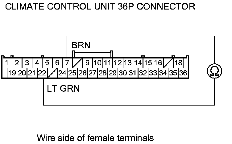 15. Measure the evaporator temperature sensor resistance between the climate control unit 36P connector terminals 7 and No. 22.