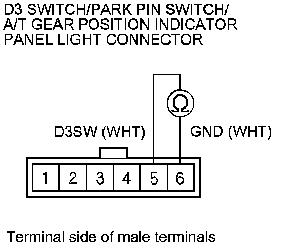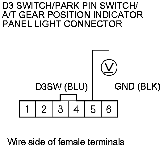4. Measure the voltage between D3 switch/park pin switch/A/T gear position indicator panel light connector terminals No. 5 and No. 6.