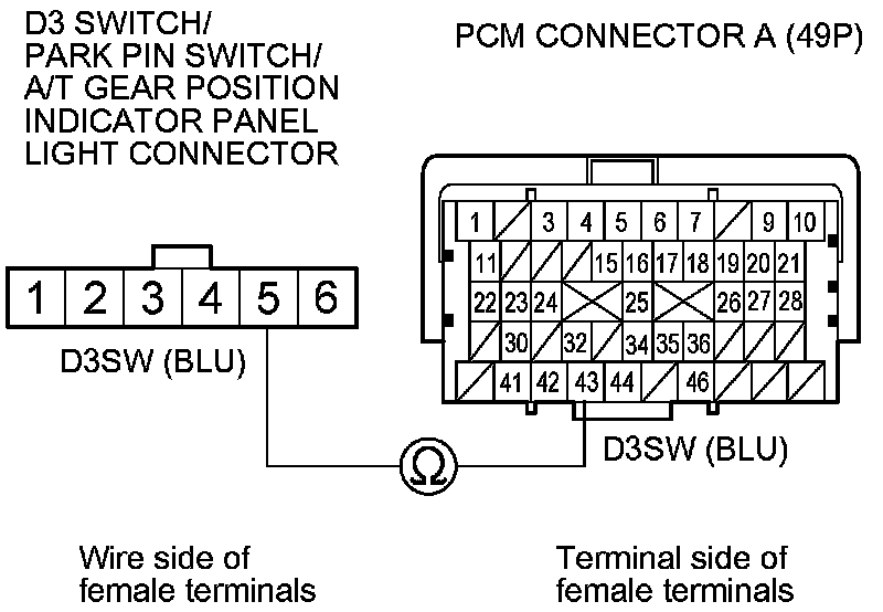 Repair open in the wire between PCM connector terminal A43 and the D3 switch/park pin switch/A/T gear position indicator panel light connector.�