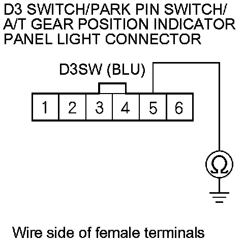 5. Measure the voltage between D3 switch/park pin switch/A/T gear position indicator panel light connector terminal No. 5 and body ground.