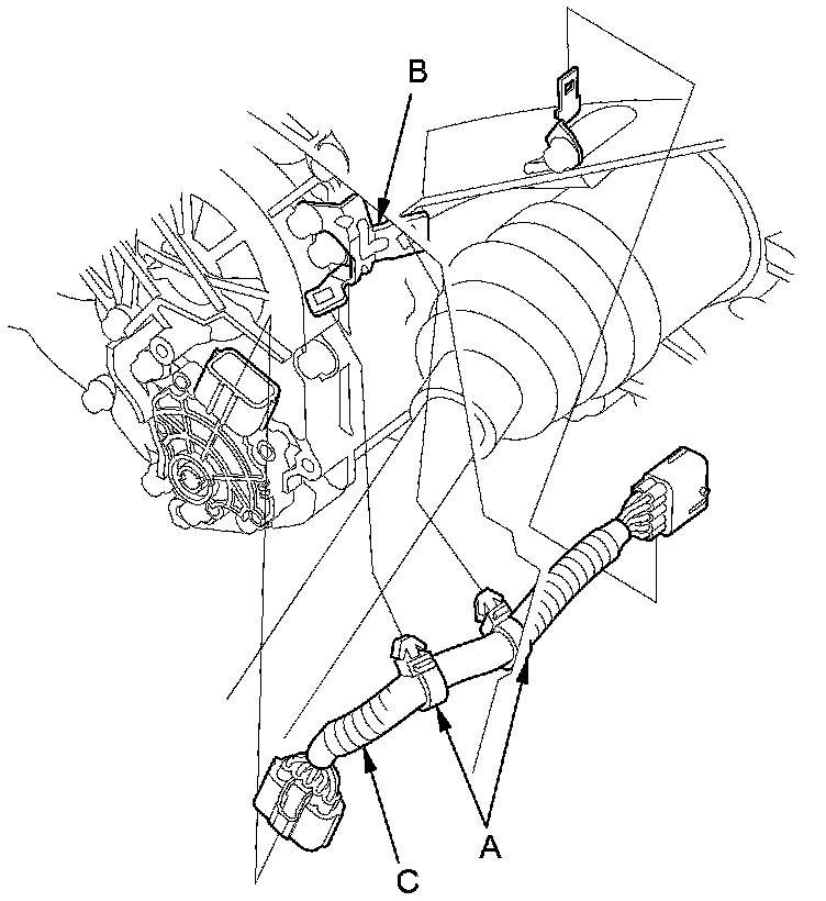 9. Remove the harness clamps (A) from the clamp bracket (B), and replace the faulty transmission range switch harness (C), then go to step 12 Transmission Range Switch Test.