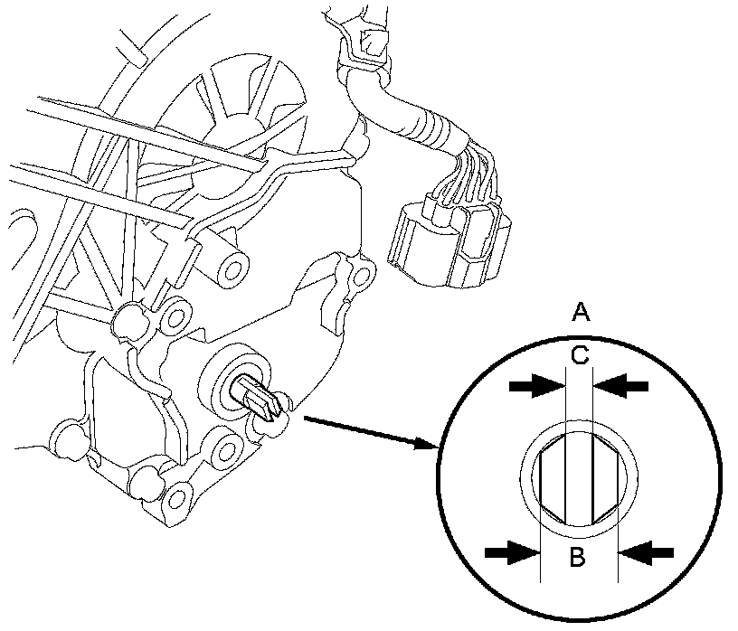 10. Remove the transmission range switch, and check the end of the selector control shaft (A).