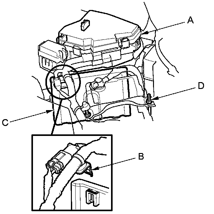 13. Loosen the battery hold down bolt (D), and reposition the battery away from the PCM.