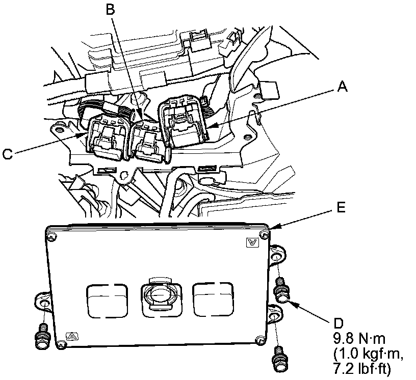 NOTE: PCM connectors A, B, and C have symbols (A=(square), B=(triangle), C=(circle)) embossed on them for identification.