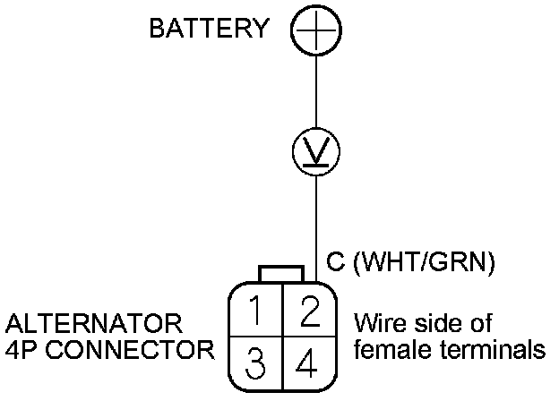 7. Measure the voltage between alternator 4P connector terminal No. 2 and the positive terminal of the battery.