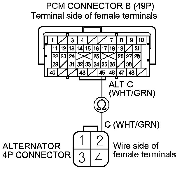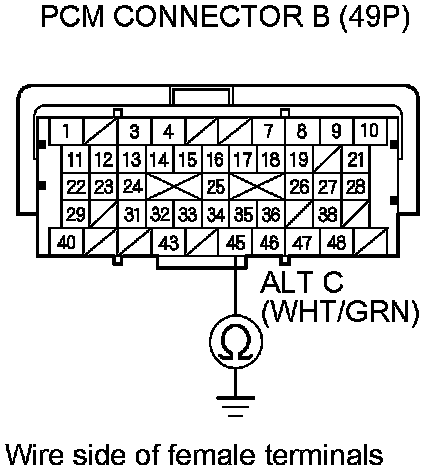 13. Check for continuity between PCM connector terminal B45 and alternator 4P connector terminal No. 2.