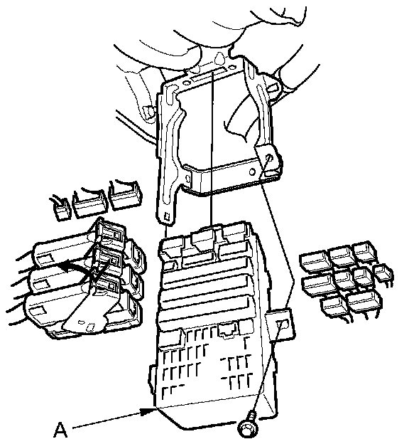 3. Disconnect the connectors from the fuse side of the under-dash fuse/relay box (A).