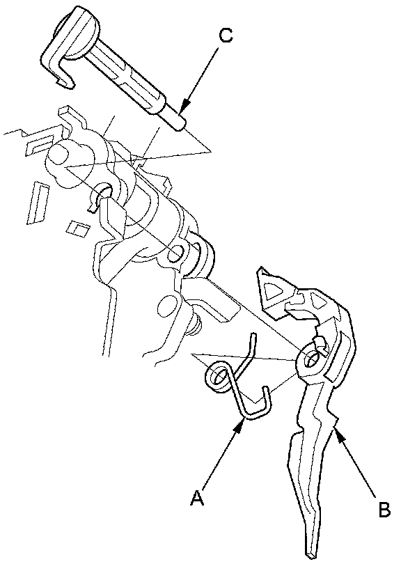 7. Install the shift lock release shaft (C) in the shift lever, and install the shift lock release and the release spring on the release shaft end.