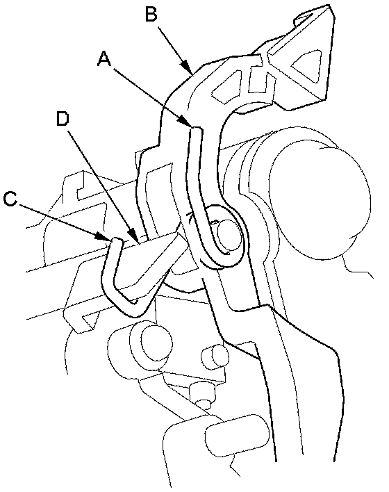 8. Make sure that the release spring end (A) is installed in the shift lock release (B), and the hooked end (C) is hitched on the catch (D).