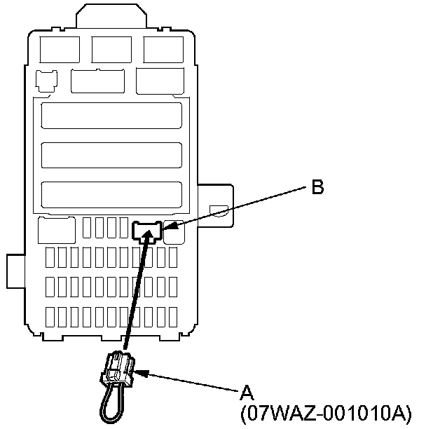 4. Connect the MPCS service connector (A) to the MCIC socket (B) in the under-dash fuse/relay box.
