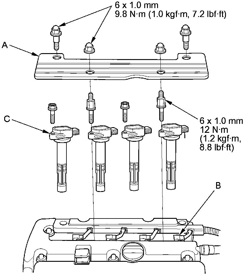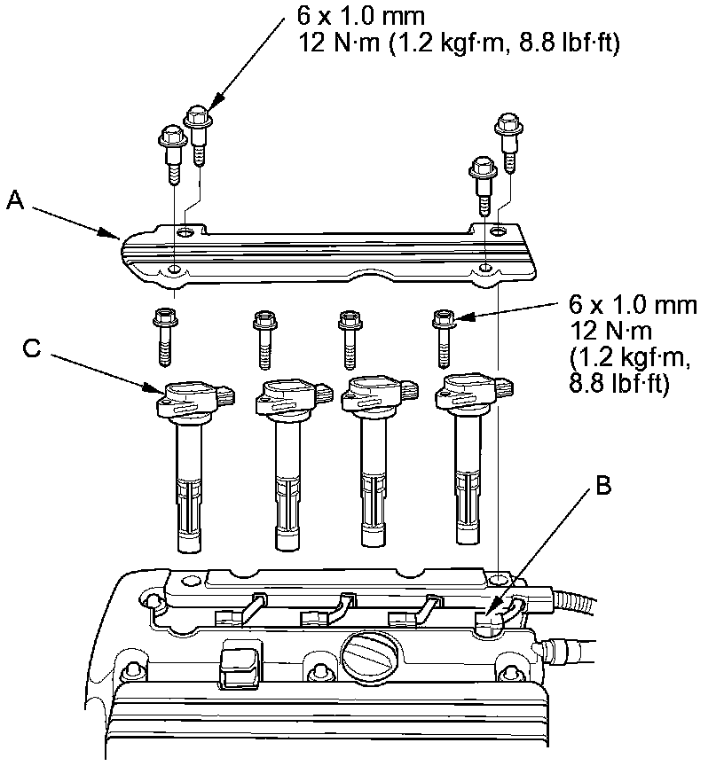 2. Disconnect the ignition coil connectors (B), then remove the ignition coils (C).