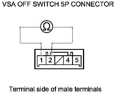 5. On the switch side, check for continuity between VSA OFF switch 5P connector terminals No. 1 and No. 2. There should be no continuity when the button is pressed, and continuity when the button is released.