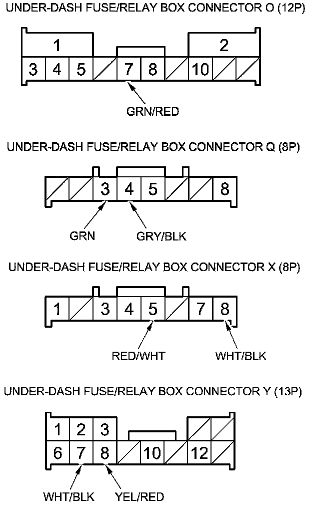 3. Disconnect under-dash fuse/relay box connectors O, Q, X, and Y.