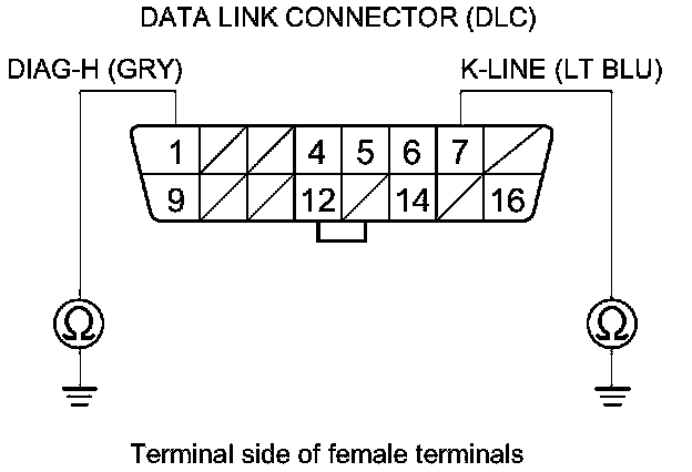16. Check for continuity between body ground and DLC terminals No. 1 and No. 7 individually.