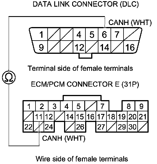 31. Check for continuity between ECM/PCM connector terminal E24 and DLC terminal No. 14.