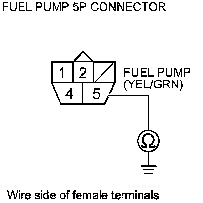 46. Check for continuity between PGM-FI main relay 2 (FUEL PUMP) 5P connector terminal No. 1 and body ground.