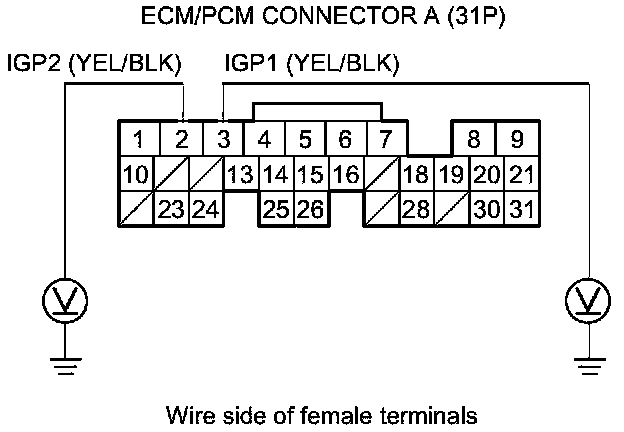 65. Measure the voltage between body ground and ECM/PCM connector terminals A2 and A3 individually.