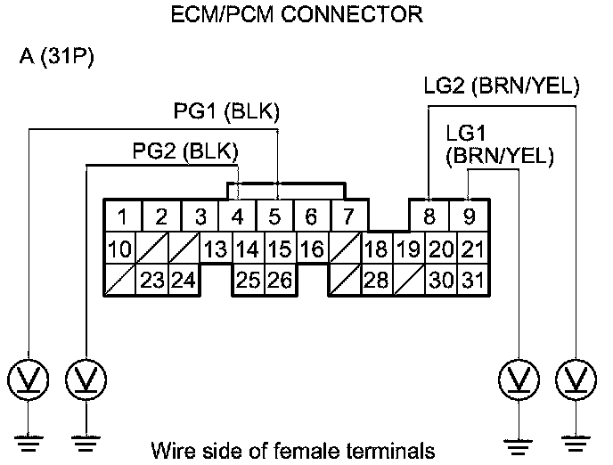 70. Measure the voltage between body ground and ECM/PCM connector terminals A4, A5, A8, A9, and E3 individually.