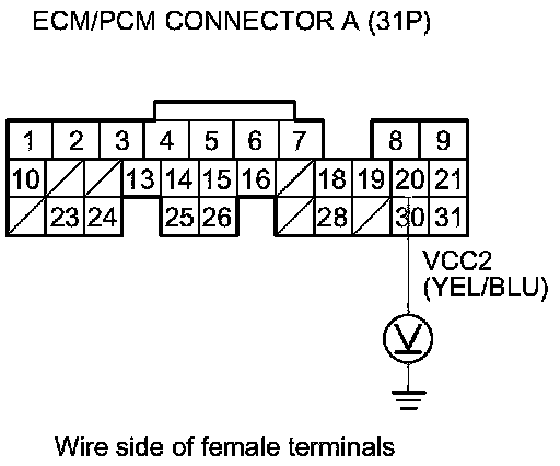 79. Disconnect the connector from each of the following sensors, one at a time, while measuring the voltage between body ground and ECM/PCM connector terminal A20 with the ignition switch in ON (II):