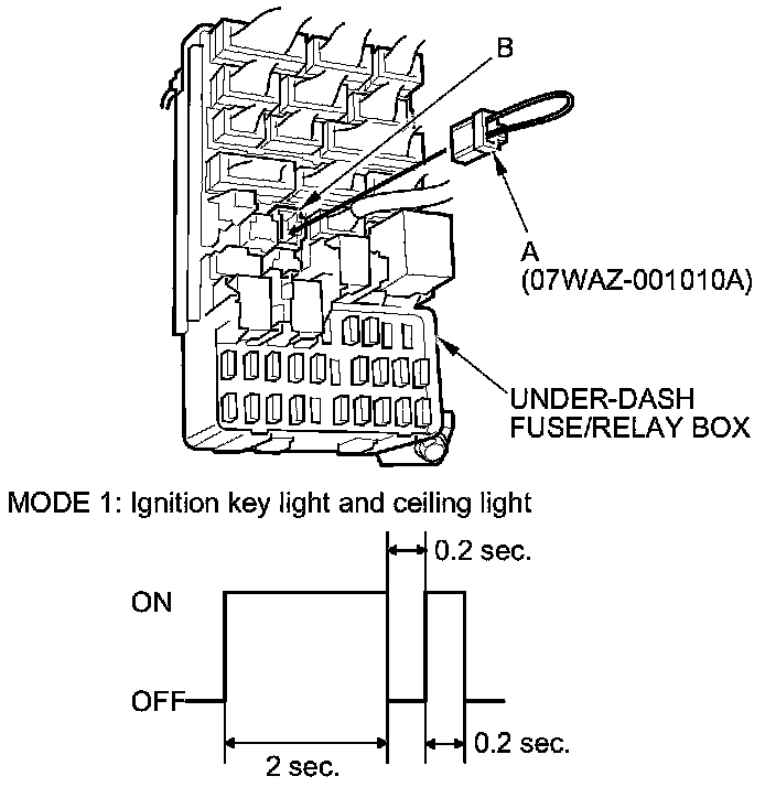 4. Check self-diagnosis function Mode 1 for a diagnostic trouble code (DTC) by connecting the special tool (A) to the multiplex control inspection connector (B). After about 5 seconds, the ignition key light and ceiling light should come on for 2 seconds, go out, then blink once for 0.2 second. This means that you are in Mode 1 of the self-diagnosis function.
