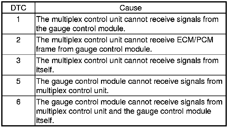 - DTC 1 only (no other DTCs present): Substitute a known-good gauge control module and a multiplex control unit one at a time, in that order, and recheck for the DTC after each substitution.