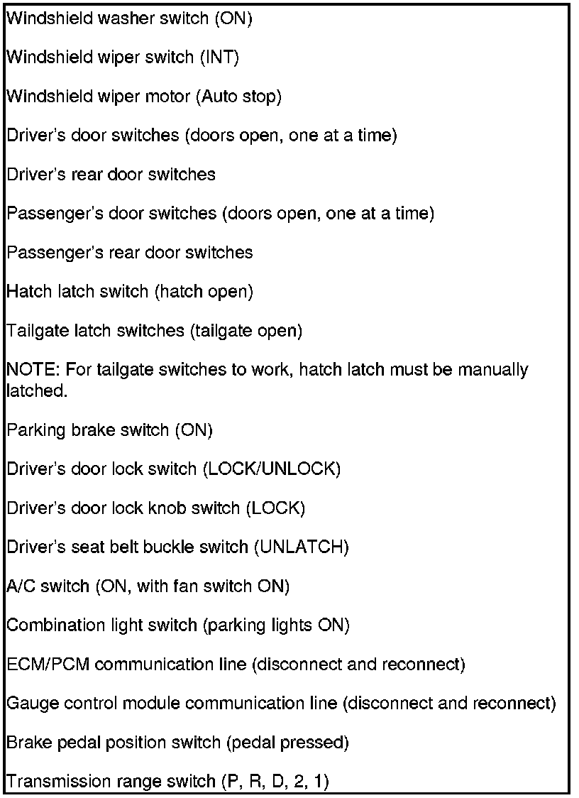10. Look in the following table for the switches most closely related to the problem. While still in Mode 2, operate the switches. If the circuit is OK, the ceiling light should blink once. If the circuit is faulty, there will be no indication.