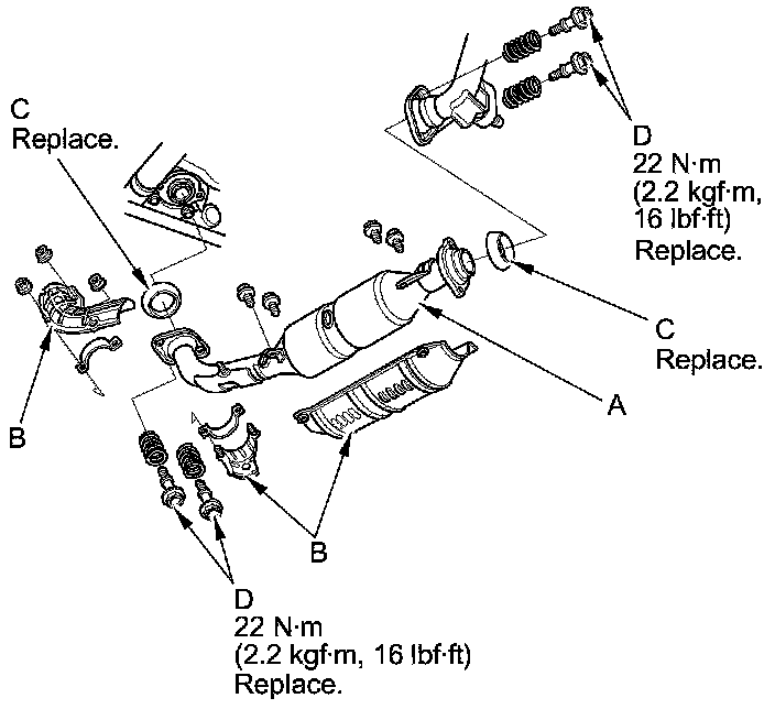 4. Install the parts in the reverse order of removal with new gaskets (C) and new bolts (D).