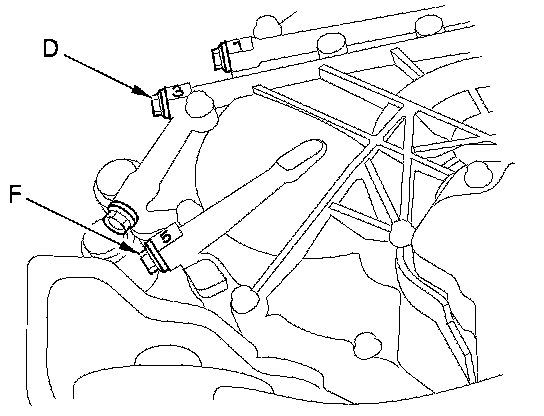 19. Connect the A/T oil pressure gauge to the 3rd clutch pressure inspection port (D) and the 5th clutch pressure inspection port (F).