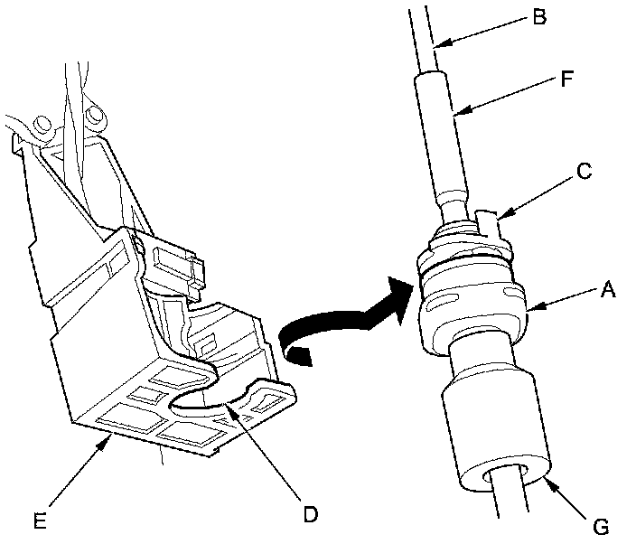 8. Rotate the socket holder (A) on the shift cable (B) a quarter turn; the tab (C) on the socket holder will be in the opening (D) of the shift cable bracket (E). Then slide the socket holder out to remove the shift cable from the shift cable bracket. Do not remove the shift cable by twisting the shift cable guide (F) and damper (G).