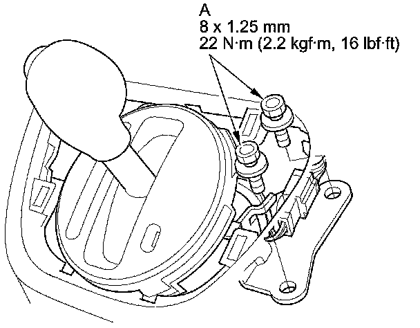 10. Remove the shift lever mounting bolt (A), and remove the shift cable bracket (B).