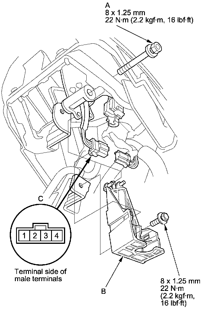 28. Install the D3 switch harness terminals (C) in the No. 1 and No. 2 cavities. Either D3 switch harness terminal can be installed in No. 1 and No. 2 cavities.