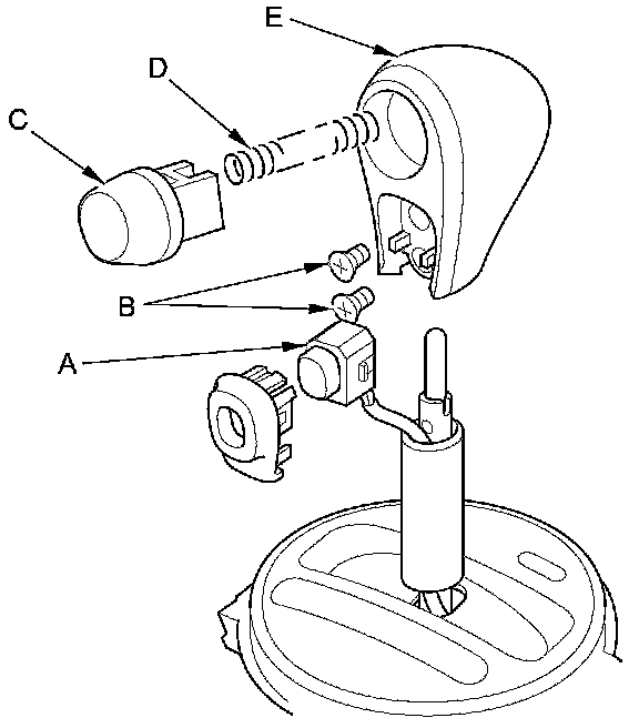 16. Remove the D3 switch (A) by expanding its lock tabs, then remove the screws (B), the shift lever button (C), the button spring (D), and the shift lever knob (E).