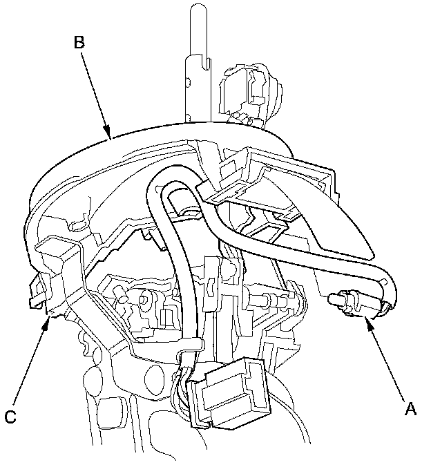 17. Remove the A/T gear position indicator panel light socket (A), then separate the A/T gear position indicator panel (B) from the shift lever bracket (C).
