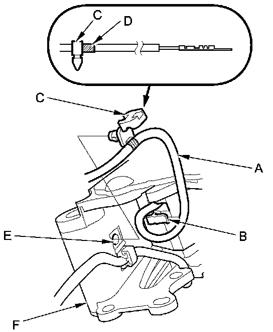 23. Install the harness clamp (C) at the reference tape (D) on the harness, then install the clamp in the hole (E) of the shift lever bracket (F).