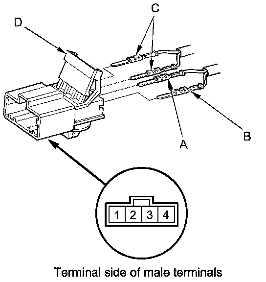 19. Remove the terminal (C) from the connector by pushing the lock tab (D) up in the connector using a thin blade screwdriver (E). Remove all four terminals.
