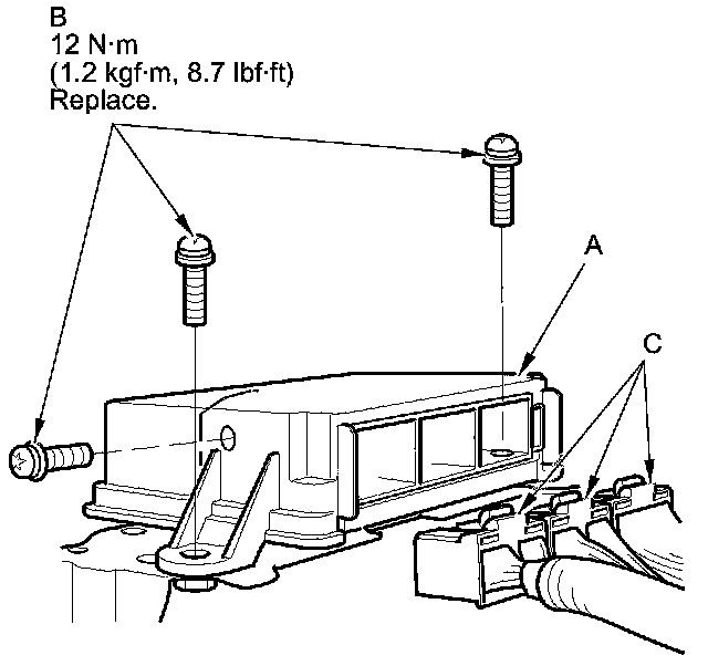 1. Install the SRS unit (A) with the new TORX bolts (B) using a TORX T30 bit. Connect the connectors (C) to the SRS unit; push them into position until they click.