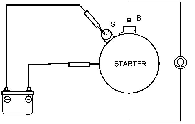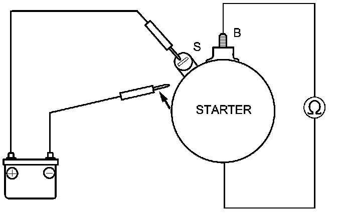 4. Connect the battery as shown, and check for continuity between the B terminal and the starter body. If there is continuity, it is working properly.