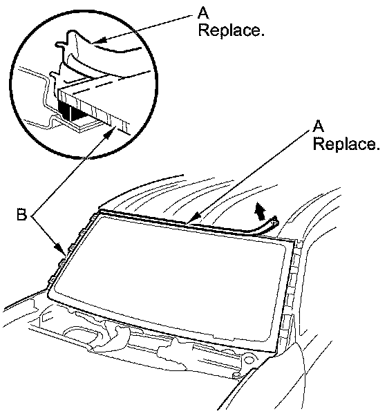 2. Remove the windshield molding (A) from the upper edge of the windshield (B). If necessary, cut the windshield molding with a utility knife.