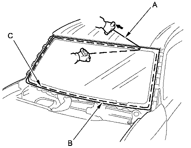 6. With a helper on the outside, pull the piano wire (A) back and forth in a sawing motion. Hold the piano wire as close to the windshield (B) as possible to prevent damage to the body or the dashboard. Carefully cut through the rubber dam and adhesive (C) around the entire windshield.