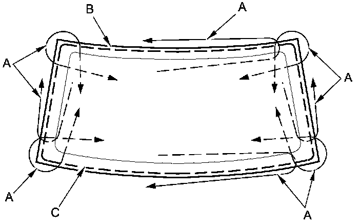 13. Attach the windshield molding (A) with adhesive tape (B) to the edge of the windshield (C):