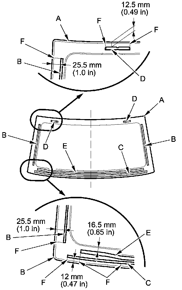 11. Apply glass primer to the upper clips mounting areas on the windshield (A), and let it dry. Remove the adhesive backing and attach the side rubber dams (B), the lower rubber dam (C), and the upper clips (D) to the windshield with adhesive tape. Attach the dashboard seal (E) to the inside of the windshield as shown: